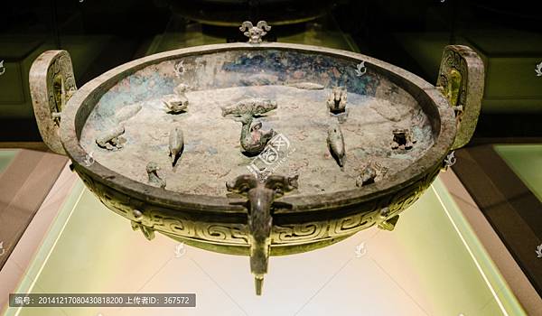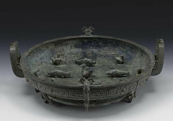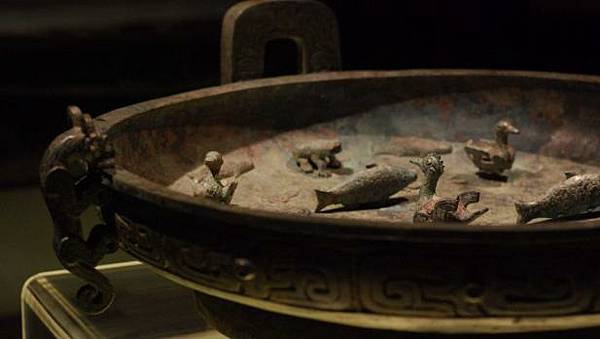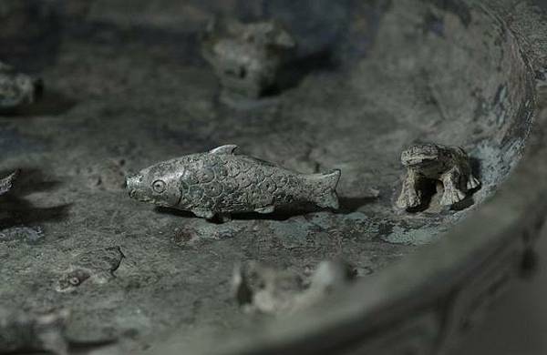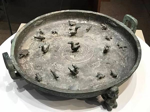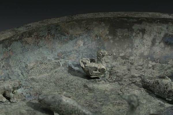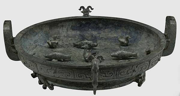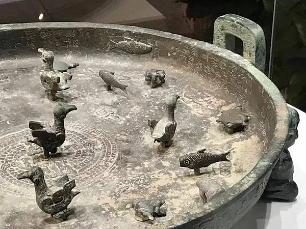 盤內鑄造了31個水族動物,有水鳥、魚、青蛙和烏龜,其中20個淺浮雕,11個立體圓雕,依照一定規則交錯排列成五圈。最令人稱奇的就是這些平均長度僅6.5公分的圓雕小動物了:一隻頭戴頂冠的雄水鳥昂首振翅中央;邊上四尾池魚悠然游弋,魚鱗清晰可辨;外圈四隻雌水鳥微微仰頭,還有兩隻青蛙蹲伏狀。一遇水流沖擊,這些小精靈就會各自歡快地旋轉起來,彷彿生命瞬間被喚醒,也把冰冷的青銅器盤變成了一處生氣勃勃的仲夏荷塘。