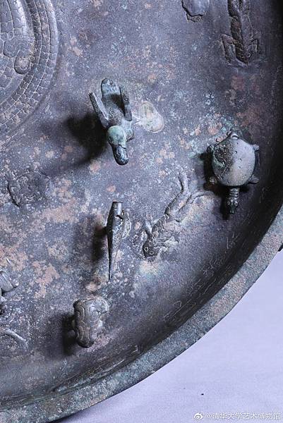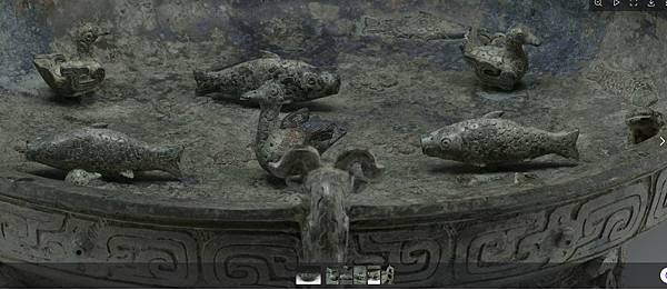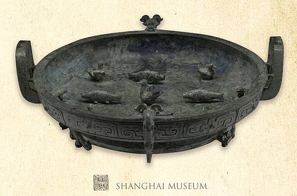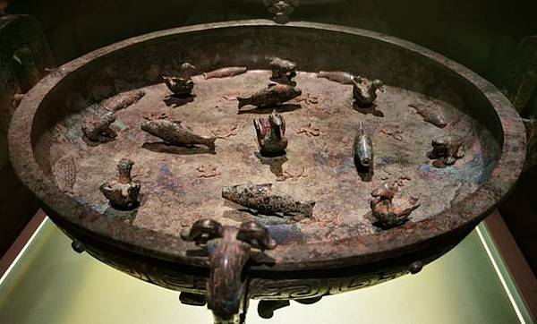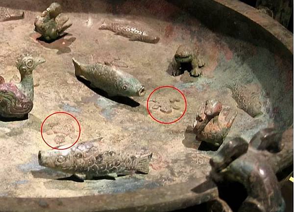 此盤絕妙之處在於盤內所鑄31個水生動物,其中有11個是圓雕,可在盤底作360度旋轉,其他20個是淺浮雕。這31個裝飾物在盤內排列成5週。