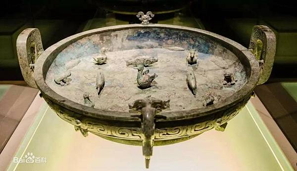 春秋子仲姜盤高18釐米,口徑45釐米,重12.4千克,盤內裝飾了浮雕和立雕的各種水生生物,魚、龜、蛙、水鳥一應俱全,每個圓雕動物均能原地作平面360度的旋轉。內壁鑄有銘文六行三十二字。 [1] 春秋子仲姜盤_百度百科 https://bit.ly/4736ghz
