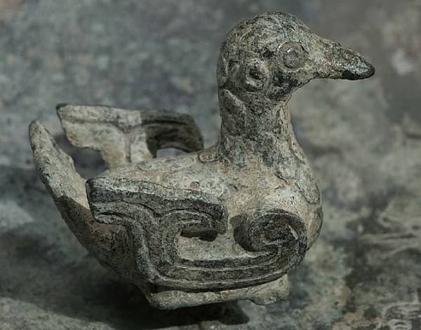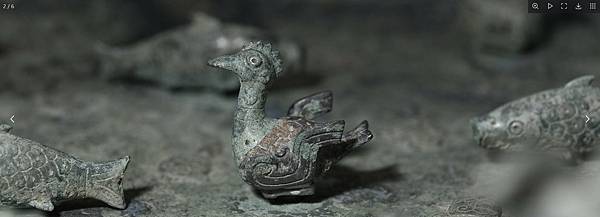 令所有鑑寶者擊出讚歎的是,盤中央鑄有帶頭冠的雄水鳥,邊上環有四條魚,外圈圍四隻無冠雌水鳥,各個造型生動。一旦有水流衝擊,就各自原處轉動360度!