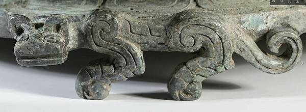整器製程精湛,構思新穎。盤壁兩側有一對寬厚的副耳高聳,其外側飾有雲紋;前後各攀一條曲角形龍,龍首聳出盤沿,作探視狀;圈足下有三立虎,虎體側面與圈足邊緣相接,若負重狀。