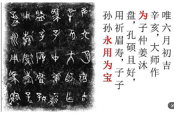 大概意思就是:在六月辛亥這天,太師為其夫人仲姜作此盤,而銅盤又大又好,用來祈求長壽與國祚長遠,希望子子孫孫永遠保用。