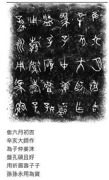 意思是,6月初吉辛亥日,太師為其夫人子仲姜作此盥洗用之盤,盤既碩大又美觀,以期祈求長壽,子孫後代永遠傳用。銘文書體工整,文字精煉簡要,用語用韻都很精妙,具有很高的學術史料價值。