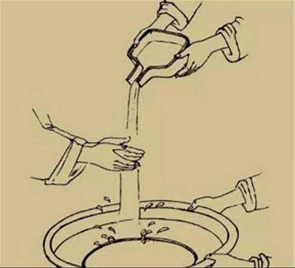 這種流水沖洗手的方式,比《紅樓夢》中所表現的貴族在銅水盆中反覆搓洗要衛生得多。 2003年國內大規模「非典」期間曾被衛生防疫部門大力推廣。