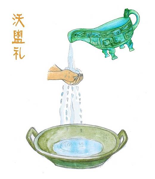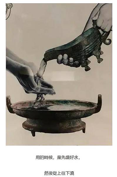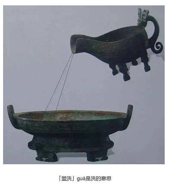 《左傳.僖公二十三年》有“奉匜沃盥”的記載,沃的意思是澆水,盥的意思是洗手洗臉,“奉匜沃盥”是中國古代在祭祀典禮之前的重要禮儀。