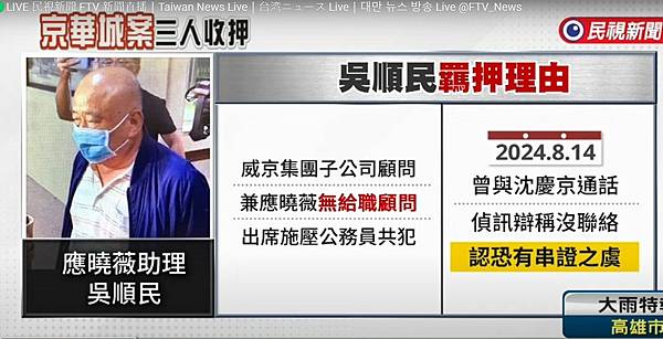 緊接著,凌晨2時左右,檢察官再先後諭令京華城董事長陳玉坤1200萬元交保、應曉薇的男友王尊侃500萬交保、應曉薇的辦公室女助理陳佳敏200萬元交保,並聲押應的辦公室助理吳順民,清晨5時許,檢察官再向法院聲請羈押沈慶京。
