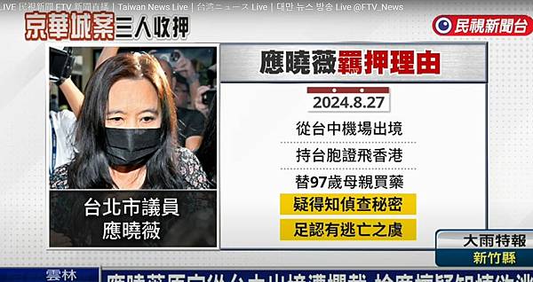 不過,檢廉前天卻接獲通報,指應曉薇出現在桃園國際機場,準備出境去香港,據了解,應獲知被境管後即離去,但她卻未返家,竟改轉往台中清泉崗機場,打算準備由該處出境,廉政署緊急派員趕往將她攔下,認為她有逃亡事實,將她拘提到案。