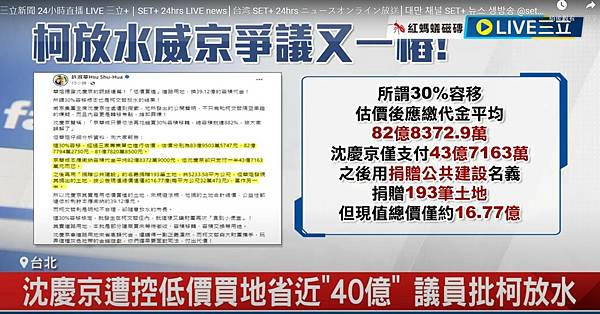 沈慶京今天發聲明宣稱,京華城容積率案他從未送過紅包,反倒是郝市府時代有官員為了個人政治和金錢利益前來索賄,但他斷然拒絕。到了柯市府也是如此,京華城不斷向市長、市府、市議員陳情,過程中有位官員透過一位律師來索賄,也被他拒絕,結果就是京華城被接連報復。該聲明曝光後隨即引發輿論熱議。