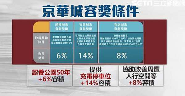 而此次容積率一事,威京集團強調,依據「都市計畫容積移轉實施辦法」第八條第一項、及「台北市容積移轉審查許可自治條例」第九條規定「容積移轉和容積獎勵不得超過法定容積50%」申請辦理,即京華城的容積移轉及容積獎勵不得超過50%,扣除容積移轉30%後,北市府核定給予京華城20%容積獎勵,而這也是目前台北市在未完成修訂法令前的通案性處理原則。