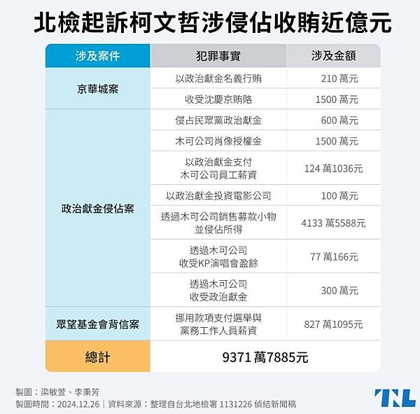 列舉柯遭起訴的相關金額,京華城案收賄共1710萬元、公益侵占柯文哲政治獻金共2324萬1036元、利用木可侵占共4510萬5754元、基金會挪用不法826萬1095元,違反《政治獻金法》共1300萬,累積加總為新台幣1億670萬7885元。涉貪比一比 吳靜怡:柯文哲=100個林姿妙 - 政治 - 自由時報電子報 https://bit.ly/41YUC6P