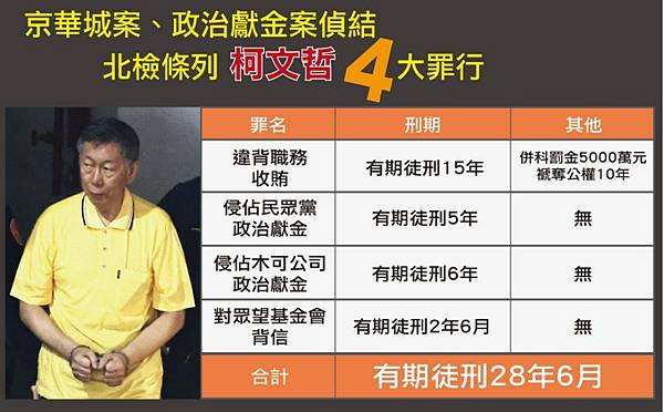 北檢偵辦京華城案、民眾黨主席柯文哲政治獻金案,去年12月26日依貪污治罪條例違背職務收賄、圖利、侵占、背信等罪起訴柯文哲,並向法院求處共28年6月徒刑。