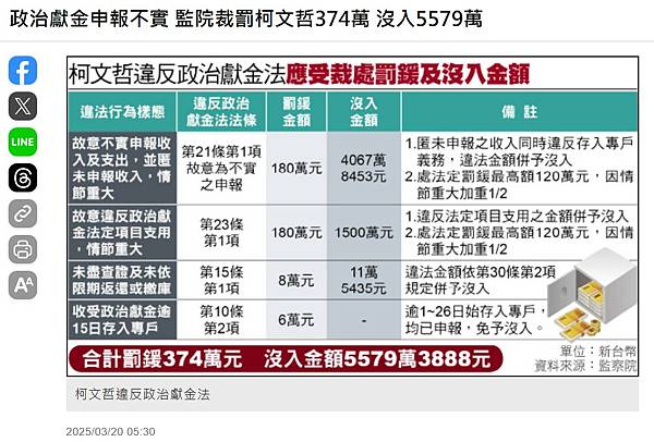政治獻金申報不實 監院裁罰柯文哲374萬 沒入5579萬 - 政治 - 自由時報電子報