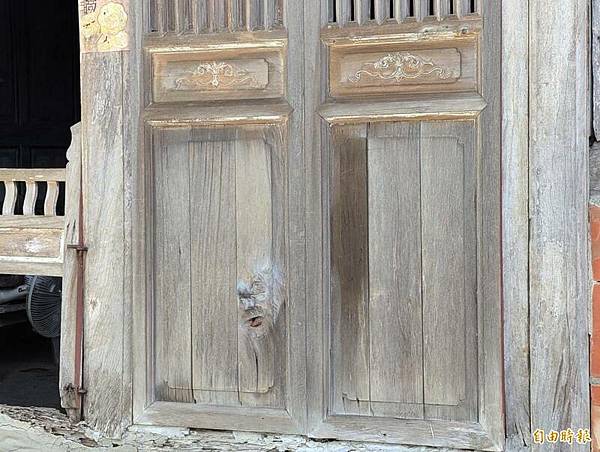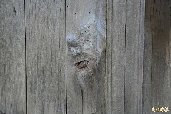 嘉縣梅山鄉安靖村詔安寮一處百年老宅門板,木節紋理經光影折射宛如浮出一張老人臉。(記者王善嬿攝)