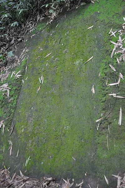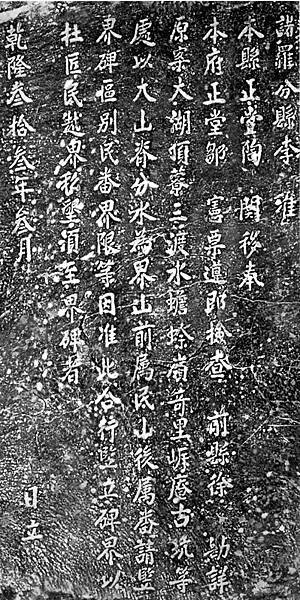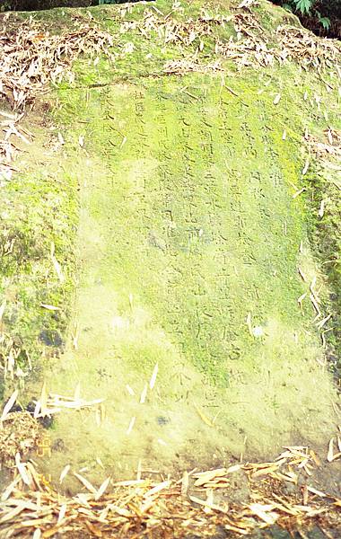 諸羅分縣李 准本縣正堂陶關移:『奉本府正堂鄒憲票,遵卽檢查前縣徐勘詳原案,大湖頂寮、三渡水、蟾蜍嶺、奇里岸、庵古坑等處,以大山脊分水為界;山前屬民,山後屬番,請豎界碑區別民番界限 等因。准此合行豎立碑界,以杜匠民越界私墾。須至界碑者。 乾隆参拾参年参月 日立。