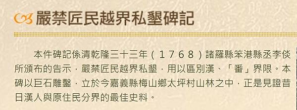 本件碑記係清乾隆三十三年(1768)諸羅縣笨港縣丞李倓所頒布的告示,嚴禁匠民越界私墾,用以區別漢、「番」界限。本碑以巨石雕鑿,立於今嘉義縣梅山鄉太坪村山林之中,正是見證昔日漢人與原住民分界的最佳史料。嚴禁匠民越界私墾碑記 https://bit.ly/3T8LDe3