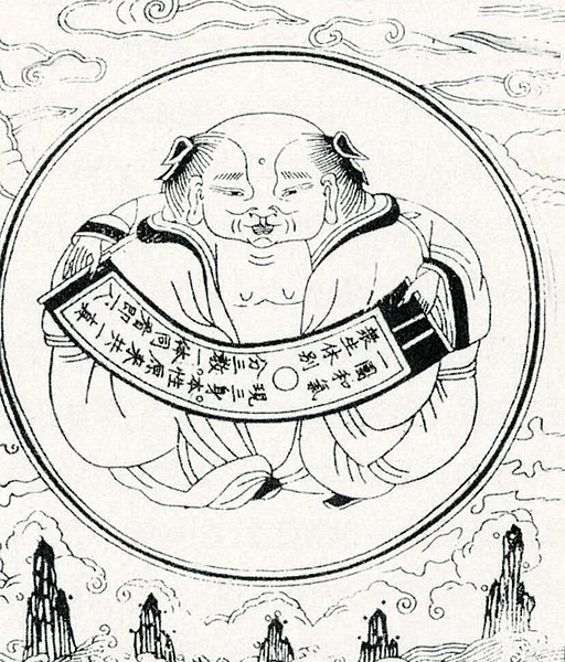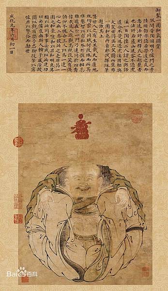 明憲宗皇帝朱見深,以虎溪三笑故事爲題,繪製了一幅名爲〈一團和氣圖〉的畫,現藏於北京故宮博物院。從遠處觀察,圖上畫了一位盤腿打坐的笑面彌勒佛,喜氣祥和。若仔細端詳,會發現其左右兩手下的寬大衣袍,一位道長正與一位儒士彼此對望著。左右兩人促膝相對、彼此凝視且面帶微笑。