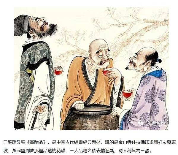 三酸圖又稱《嘗醋翁》,是中國古代繪畫經典題材,說的是金山寺住持佛印邀請好友蘇東坡、黃庭堅到他那裡品嚐桃花醋,三人品嚐之後表情迥異,時人稱其為三酸。