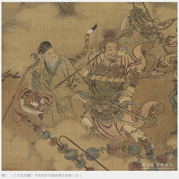 圖5 〈三官出巡圖〉中為地官引路的黃衣老者(左)與猛虎相伴、為地官引路的黃衣老者(圖5)則應為土地神