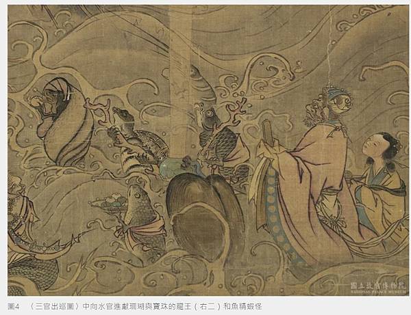 圖4 〈三官出巡圖〉中向水官進獻珊瑚與寶珠的龍王(右二)和魚精蝦怪