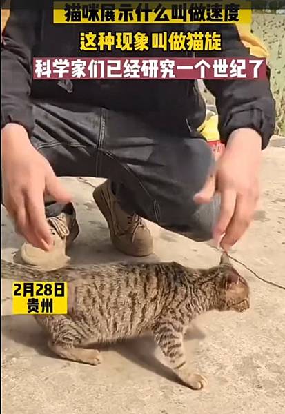 貓從高空落下來,翻身轉體的過程,科學家們稱為“貓旋”,而且是科學家長期探索的課題。 1882年,法國科學家馬雷首次用高速攝影機將“貓旋”這一過程拍攝了下來,並證明了貓在空中轉體,僅需1/8秒鐘。“貓旋”使科學家產生了極大的興趣。