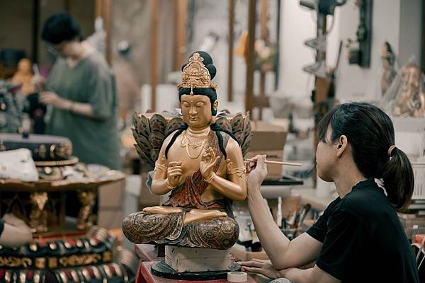 陳慧芬之妹妹陳銘真正在為佛像上色。 日本寺廟藏有新竹製造?你不知道的台灣之光──佛像工藝師陳慧芬 | 藝開罐 | 琅琅悅讀