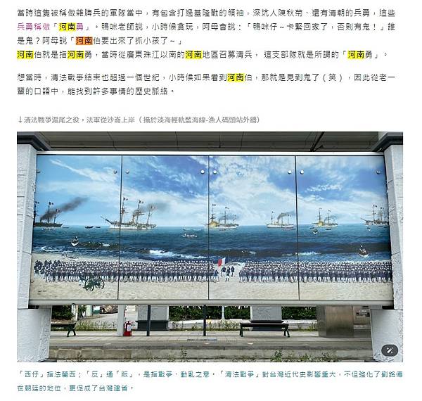我初聞之時,覺得不可思議,查詢資料,發現晚清時期的台灣確實召募過來自廣東珠江河南一帶的兵勇, 這些「廣東河南勇」並不像淮軍裡的河南省籍兵勇只是軍中少數,他們是整營的「河南勇」,且都駐札於台北地區。