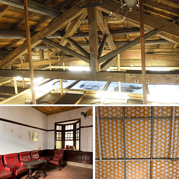 上/二樓屋架,左下/客廳和凸窗,右下/客廳天花板(甘蔗板)。