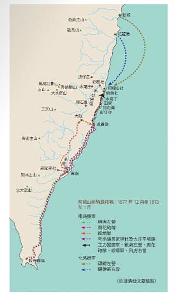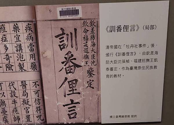 註:《訓番俚言》:開山撫番政策,也是臺灣在光緒年間,產生許多「訓番俚言」、「化番俚言」或是「教番歌」的歷史背景。如開山撫番負責中路的總兵吳光亮,就於光緒5年(1879)撰寫〈化番俚言〉32條,用以教化後山原住民。