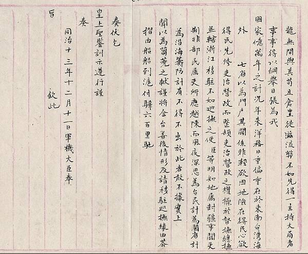 清光緒政府,來台接觸原住民,面對他們的生活方式、文化,一定發現與漢人很大的差異。清政府是以自己領土的角度來看原住民嗎?為何不會覺得他們不是漢人而去給他們類似「自治」的權限。很顯然清政府是有意在台灣建立大清帝國的統治權。或許文化的外貌,在當時很容易用進步或落後來評斷。因為大清已經從強盛帝國本位中心,經歷過歐洲國家的先進科技、航海等國力經驗。這時候的大清看原住民應該就是看著原始人的眼光,覺得他們「落後、未開化」。因此產生這樣的文件,要「教育」原住民。然相信其中一定也有好的影響。