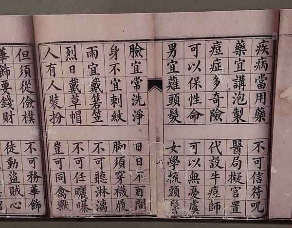 一、學習規矩,以知禮義。爾等每逢飲食,均於地坐,男女不分。偶遇外人到家,遂相喧嘩,不曉避嫌。男女共器並飲並食,殊屬可醜。今後有力之家,須置桌椅,數人聚集一桌,男有男行,女有女行,不得同坐一席。晚間睡臥,分別房間。夫妻方許同床;如系子女、兄弟、叔姪,則別床鋪,乃不紊亂。至講話須要謙恭,行坐須循規矩,禮義不可不知。