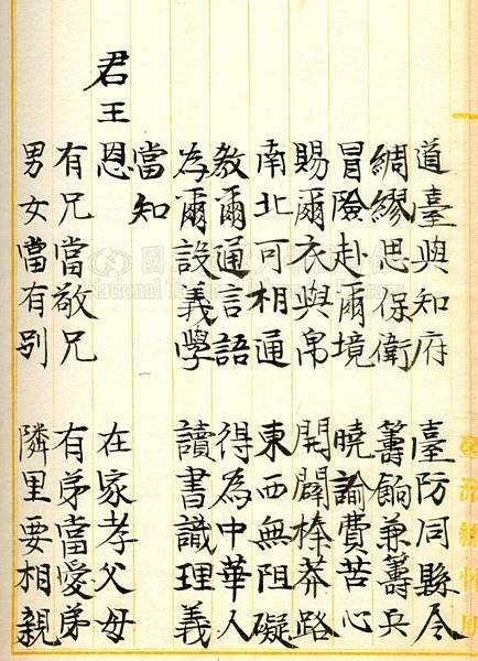 一、分別五倫,以知大體。何謂五倫?君臣、父子、兄弟、夫婦、朋友是也。君為至尊,為臣者當盡忠。臣系朝廷命官,爾等叩見官府,必須恭敬,肅靜侍立,毋得亂講亂笑,肆無忌憚。為父當慈愛子女,不可使之饑寒。子女稍長,則教之以禮義廉恥,不可任其妄為。為子須孝順父母,盡心奉養,不可忤逆。至為兄長者,須友於弟,如弟年幼則提攜撫養,稍長則隨時教訓,不可妒忌,不可嫌棄。為弟者更要恭敬兄長,聽從教訓,不可恃蠻干瀆。夫婦須要和順,勿因小過反目分離。朋友相交,須以信義。凡系公正之人,最宜親近;其凶惡之輩,切勿與交。此乃五倫之要道,爾等分別遵從,切勿違忽!
