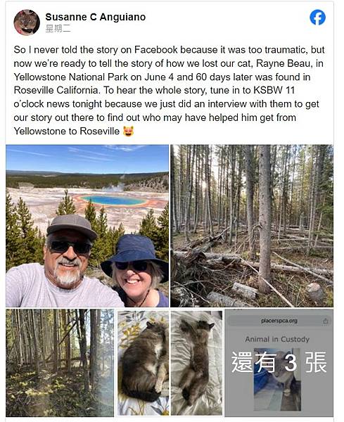 安吉亞諾夫婦之前開著露營車帶貓露營好幾次,兩隻愛貓喜歡在車上看著窗外的動物。這次Ryane到黃石公園營地,似乎是被什麼東西嚇到,才會跑走。他們說,短時間內暫時不會再帶貓去遊山玩水,會先在家露營,讓貓習慣。