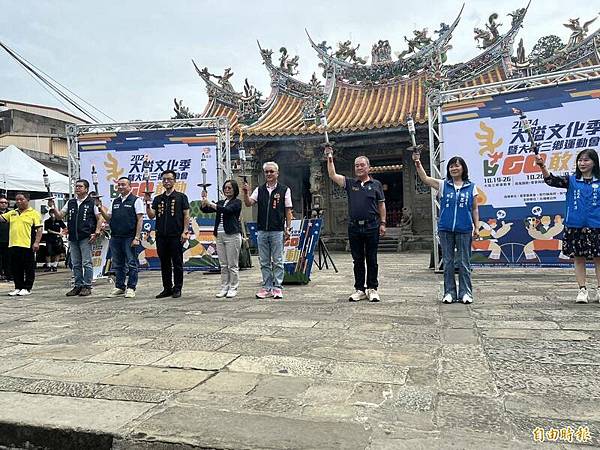 新竹縣「大隘文化季」暨大隘3鄉(北埔鄉、峨眉鄉、寶山鄉)運動會將於10月26日熱鬧登場,今天(30日)在北埔鄉慈天宮舉辦聖火傳遞啟動儀式。(記者廖雪茹攝)