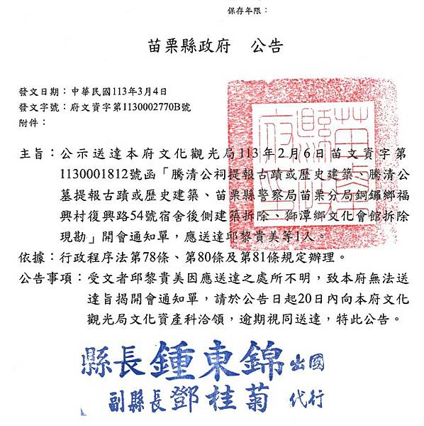 另外,針對縣定古蹟「苗栗義塚」定著土地分割部分,苗栗縣府文化觀光局表示,因其原定著地號過於遼闊,使土地所有人之土地發展權受到限制。經過審議會委員建議保留古蹟周邊通道,方便日後有關苗栗義塚各項活動使用,未來古蹟周邊如有開發行爲,應依文化資產保存法相關規定辦理。通霄騰清公祠 獲登錄歷史建築 - 自由藝文網 https://bit.ly/3TYZDaO