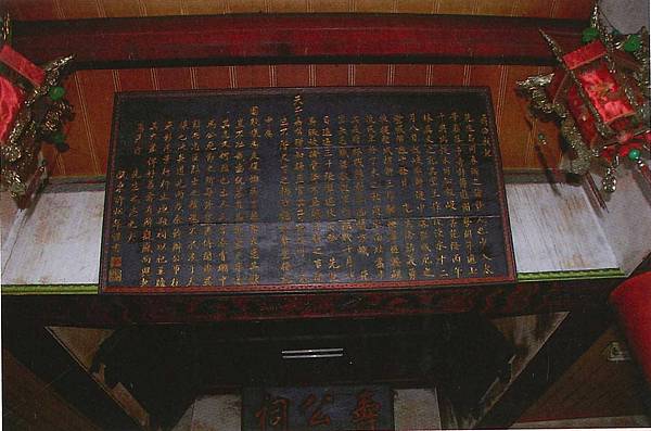通霄壽公祠記立於道光6(1826)年,位在通霄鎮中正路3號旁,掛於壽公祠的正殿橫樑,為木匾,無落款年代,縱87公分、橫164公分。簡介在林爽文事件中殉難的壽同春。