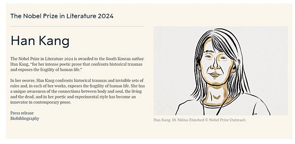今年諾貝爾文學獎頒給南韓作家韓江,她也成為首位獲諾貝爾肯定的南韓作家,已故大統領金大中獲和平獎後,第二位獲諾貝爾肯定的韓國人。