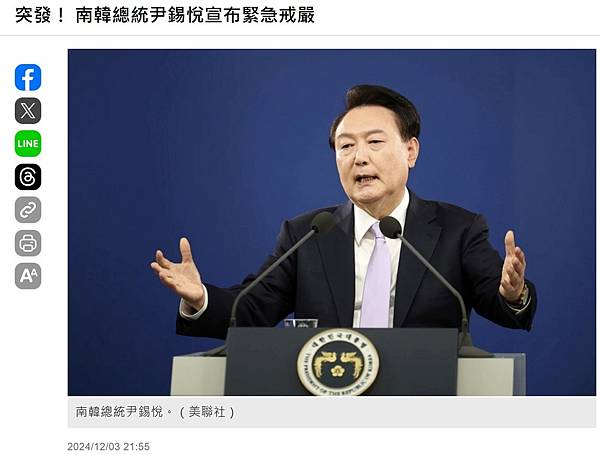 突發! 南韓總統尹錫悅宣布緊急戒嚴 - 國際 - 自由時報電子報