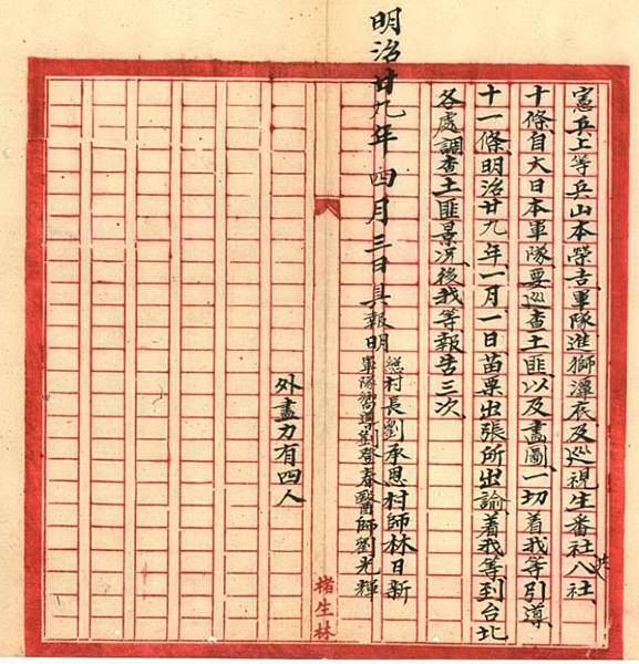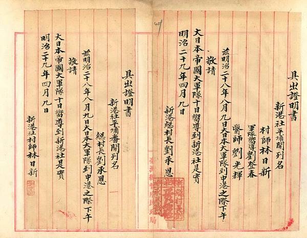 另一件是〈具出證明書〉(如圖4),劉承恩等人相互證明,在明治28(1895)年8月9日到中港迎接日軍,並在10日引導日軍到新港社。這份文件是為了日本人給發賞金而寫,最後日本人發給劉登春賞金25円,劉承恩、林日心、劉光輝各20円。