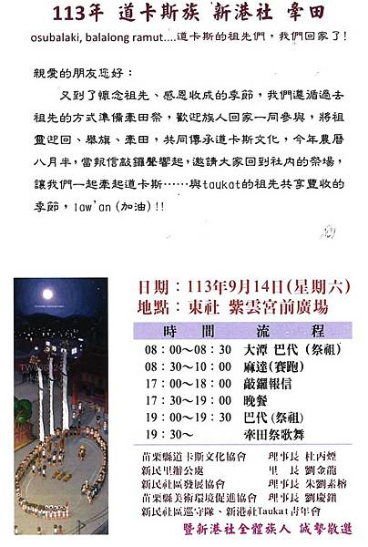傍晚由社內頭人帶領著三位舉旗手沿著東西社挨家挨戶,敲鑼通知族人們晚上來參與牽田,隨後在patay祭祖後,族人們跟著旗手揹上三支高達約三層樓的大旗,將祖靈迎回,男女老少手牽著手圍繞著旗手們,吟唱起牽大田祭歌,踩著祖先傳承的步伐,感恩祖先,傳承道卡斯文化。2024道卡斯族新港社牽田祭 9月14日在後龍東社紫雲宮登場 – 台灣新聞雲 https://bit.ly/3BK5QRO