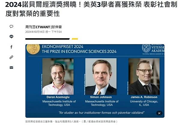 2024諾貝爾經濟學獎:美國3學者證明社會制度對國家繁榮的重要性獲獎 - TNL The News Lens 關鍵評論網 https://bit.ly/4dGFdul