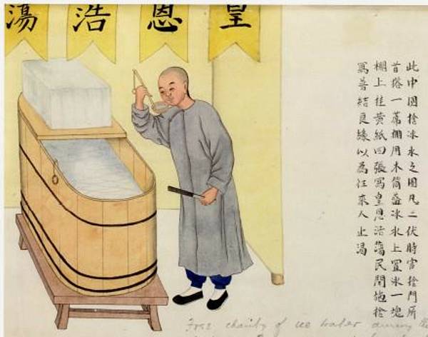 這樣的行為發展到後來,也許各地方因地、因時制宜。《大英圖書館特藏中國清代外銷畫精華》收錄一些關於北京風俗的圖畫,其中一幅繪著一個簡單的棚子,外面大書「皇恩浩蕩」,內置一個木桶,裝著一個大冰塊,有個人正拿著木杓抄了口水要喝。圖旁的文字說明了這是北京三伏天在官衙門口搭的茶棚,若是民間所為,棚上的黃紙則改為「普結良緣」。