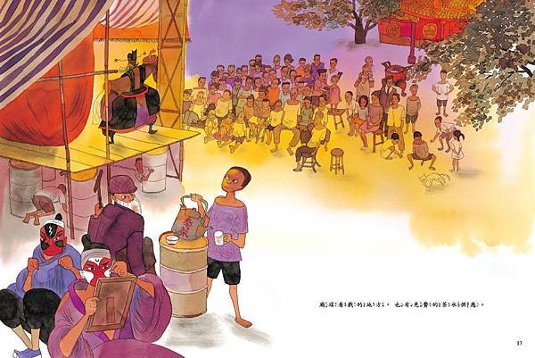 在這個故事中,有一個角色一直沒有出現,就是茶壺裡或桶子裡的茶水,是誰準備的呢?他又是如何選定擺設奉茶的地點呢?除此之外,土地公喝了茶之後,故事會怎麼發展的?不妨在翻到下一頁前,誘導孩子來想想情節可能的發展!