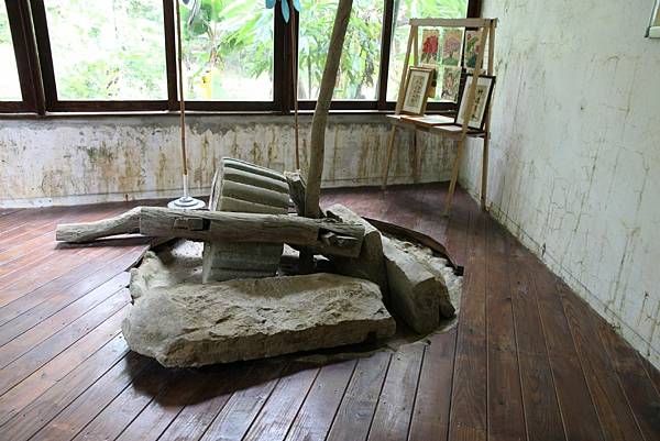 劉邦廣表示,獸力碾料是製紙的重要流程,經過碾壓才能快速破壞竹子纖維,石輪的大小不一,但內俓要小於外俓,這樣牛拉的時候才不會往外轉,同時牛靠內側的眼睛要遮起來防止他停下來吃竹子。因為竹子纖維粗, 石輪碾壓用的齒要寬大,齒溝亦深,依二房置於輪寮展示的石輪:外俓 92公分、內俓 87 公分、後 40 公分、齒寬 6 公分、齒溝寬 4 公分深 2 公分、輪軸孔 9 公分四方。