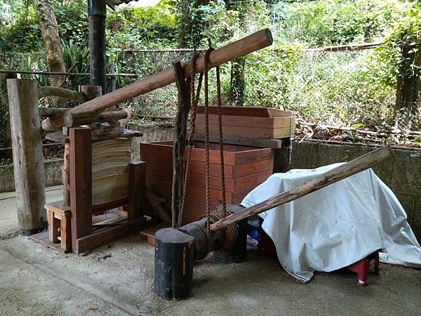 7. 古法壓紙:將撈起的紙張疊在壓紙器,先將壓紙木桿定在較高支點壓紙, 等水分滲出後再將木桿轉至較低支點(木桿呈水平)水分滲出後表示已經夠乾了,太乾紙會破,通常上午、下午、晚上各做 1 絞紙。