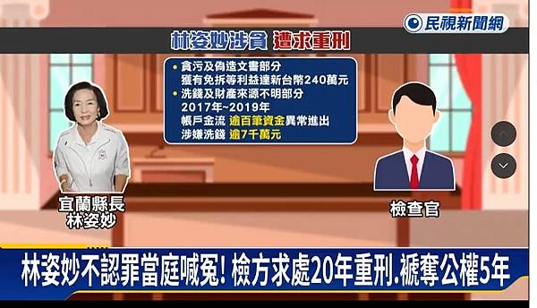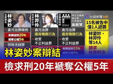 宜蘭地方法院審理宜蘭縣長林姿妙等人涉貪案,今天(23日)辯論終結,檢方依貪汙收賄罪向法院求處林姿妙20年徒刑,褫奪公權5年,是15名被告中求刑最重,林姿妙在庭上重申清白,法院將在12月31日下午2時30分宣判。