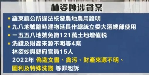 本案被告包含林姿妙、其女兒林羿伶及縣府團隊共15人,涉貪污、偽造文書、財產來源不明、洗錢等罪嫌,起訴書指出,林姿妙等人處理民間地主免徵112萬土地增值稅,換取地主提供土地作為國民黨韓國瑜當時角逐總統大位的宜蘭競選總部,該土地過去亦為林姿妙2018年的縣長競選總部;林姿妙藉此獲益240萬元。