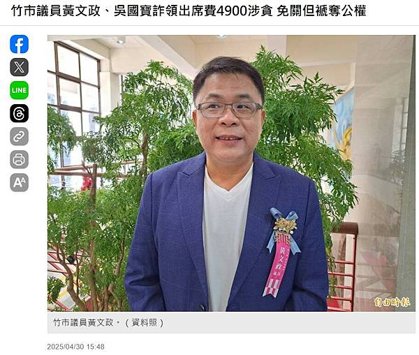 竹市議員黃文政、吳國寶詐領出席費4900涉貪 免關但褫奪公權 - 社會 - 自由時報電子報 https://bit.ly/4cZZDzE