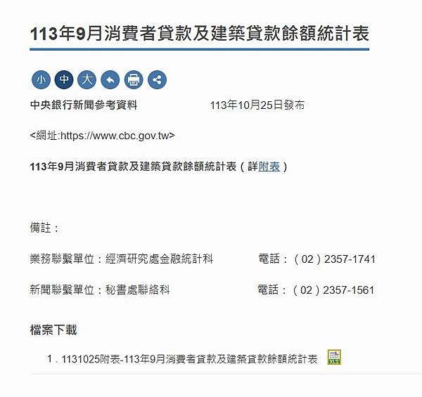 中央銀行-中文版-最新消息-新聞稿-113年9月消費者貸款及建築貸款餘額統計表