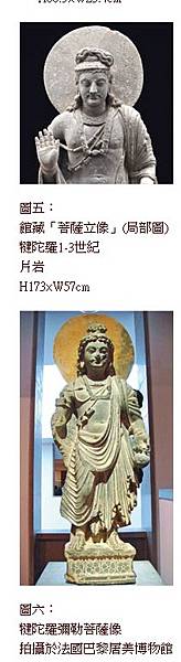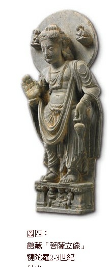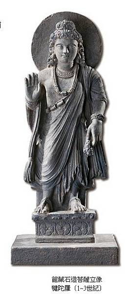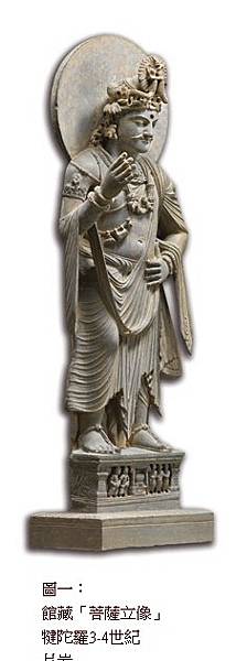 犍陀羅藝術(Gandharan Art)是印度佛教思想與希臘造形藝術的結合,融入西方雕塑的寫實性,具有濃厚的希臘化風格。如館藏犍陀羅「菩薩立像」(圖一),太子般氣派,高貴不凡,古典寫實,典雅俊美。髮辮自然捲曲,華貴珠串冠飾,纏繞眾寶瓔珞,頂飾燕尾榫冠。額部較寬,眉間白毫,深目、高鼻、薄唇的西方面孔,上唇八字型髭,神情悅豫端詳。袒露上身,披著天衣,輕繞上身,帔帛從右肘穿過,於腰腹前成一道流暢律動的大圓弧型衣紋垂掛,天衣纏繞左肩懸垂而下。下著腰衣及腰帶,右膝微屈,牽動衣褶紋飾流動,裙裾似垂簾,裙襬呈齒狀開展,這是犍陀羅菩薩造像的服飾特徵。