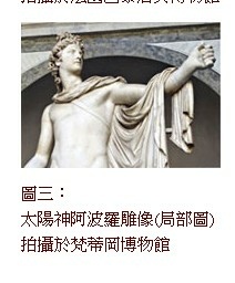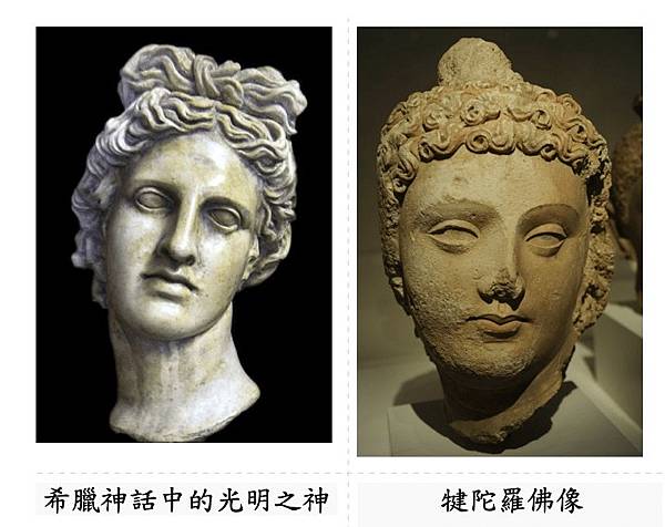 印度佛像身著希臘羅馬式披袍,衣褶厚重,富毛料質感,優美、典雅、和諧的形制,可以追溯到古希臘的理想造形。犍陀羅菩薩的面貌特徵、美學原則與寫實技巧,具有濃厚的希臘化色彩,帶著西方太陽神阿波羅的英拔風采,如梵蒂岡博物館所藏之太陽神阿波羅雕像(圖三)。太陽神阿波羅在西方文化中,象徵清澈明淨的精神境界,在藝術上以古典沉靜的造形,表達一種清新典雅的理性清明世界。犍陀羅造像青灰色調的片岩石材,結合人物沉靜肅穆的神態,愈益顯出一種阿波羅式的靜謐、內省風格。
